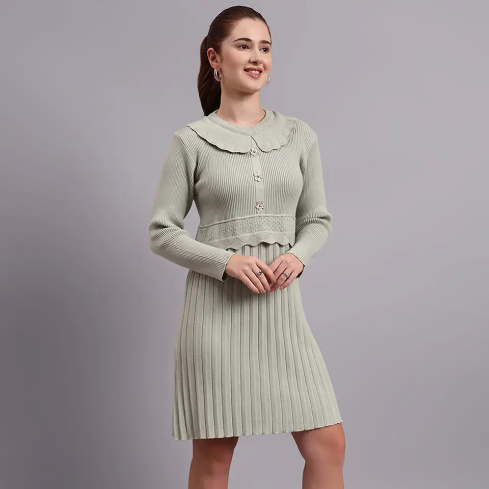 Women’s Sky Blue Ribbed Knit Winter Dress with White Collar & Navy Border