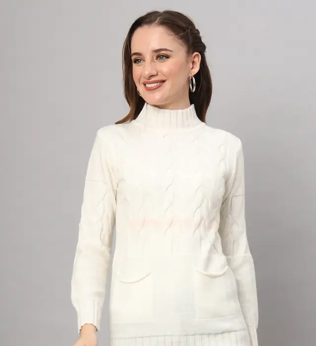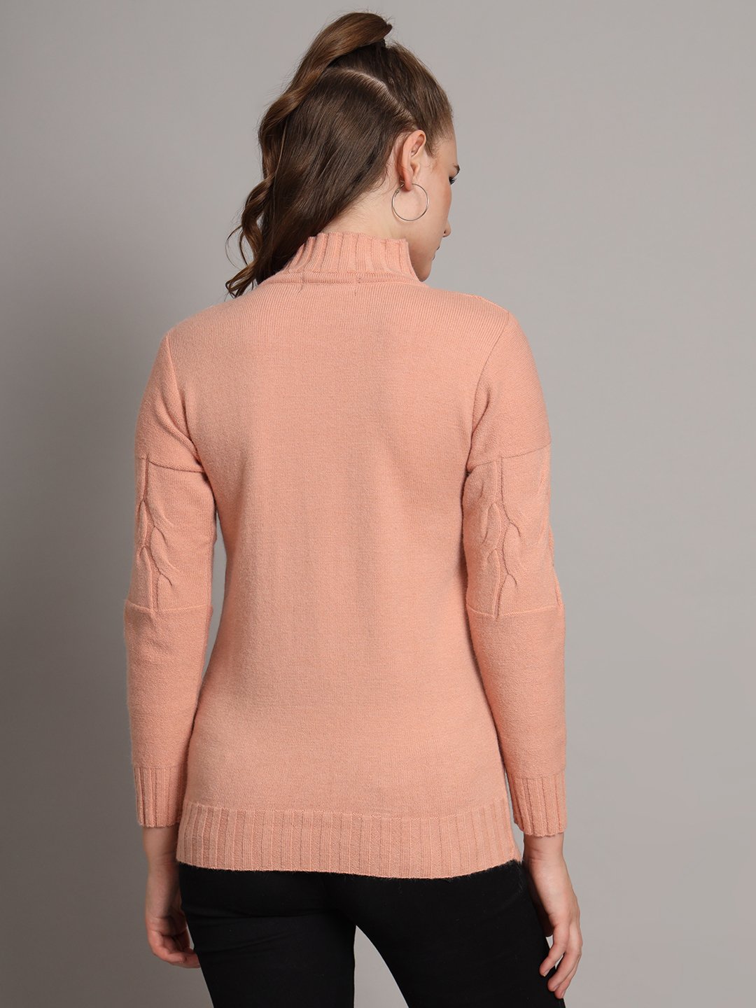 Women’s Peach Cable Knit Mid-Length Winter Top with High Neck & Front Pocket