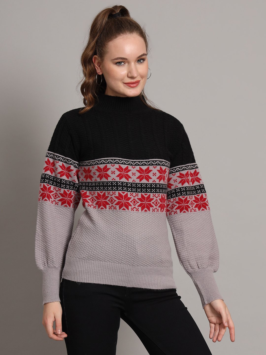 Women’s Black & Grey Fair Isle Pattern Mid-Length Winter Top with High Neck