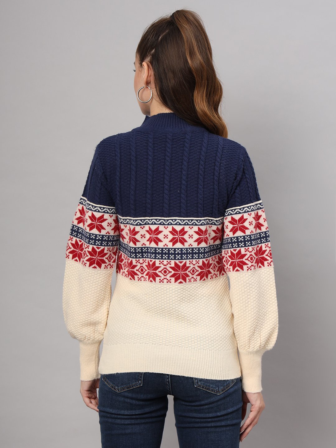 Women’s Navy & Cream Nordic Knit Mid-Length Winter Sweater Top