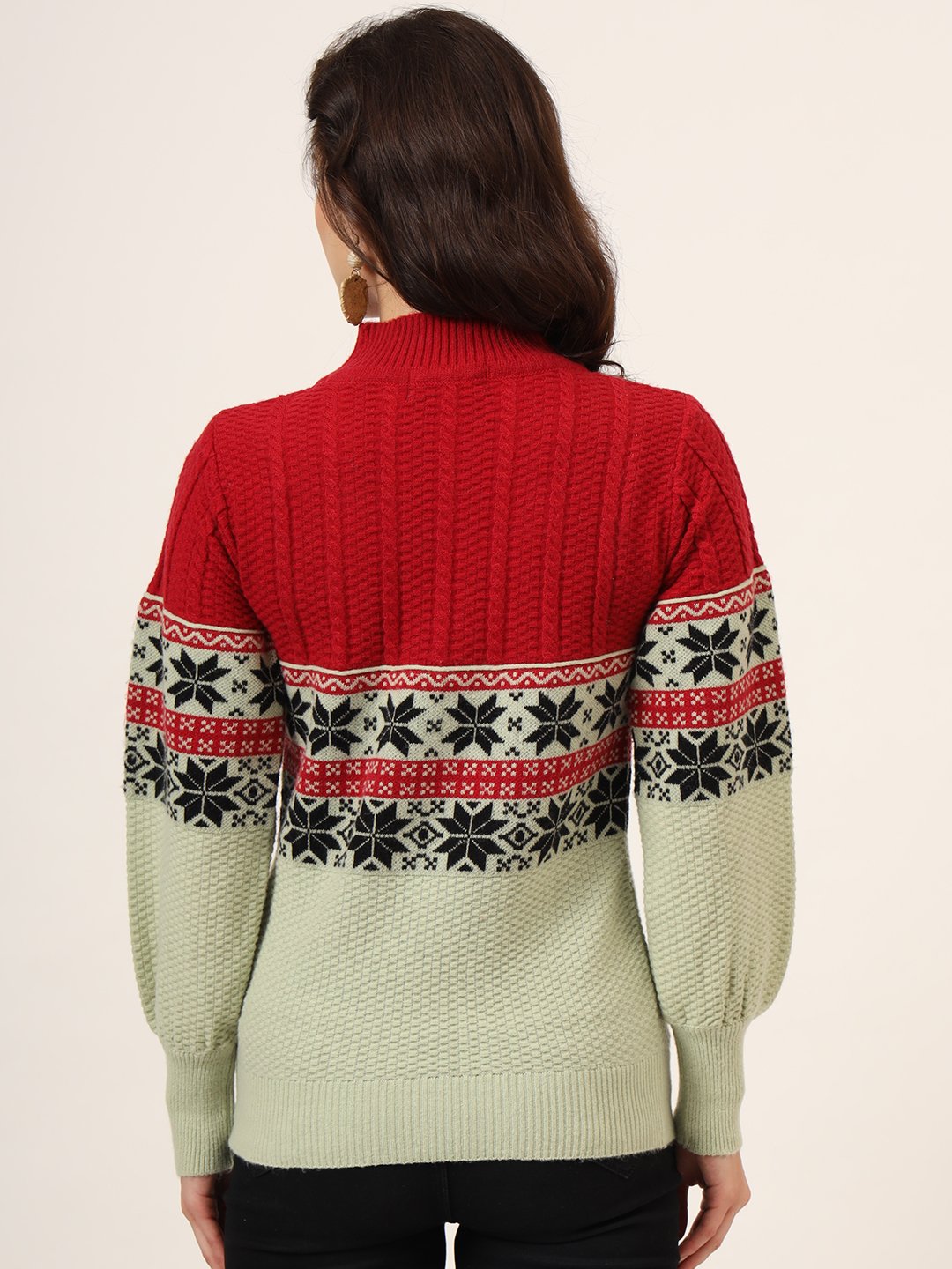 Women’s Red & Mint Green Fair Isle Knit Mid-Length Winter Sweater Top