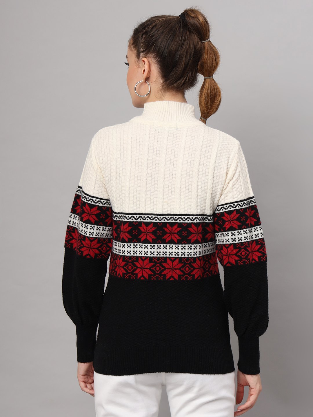 Women’s White & Black Nordic Knit Mid-Length Winter Sweater Top
