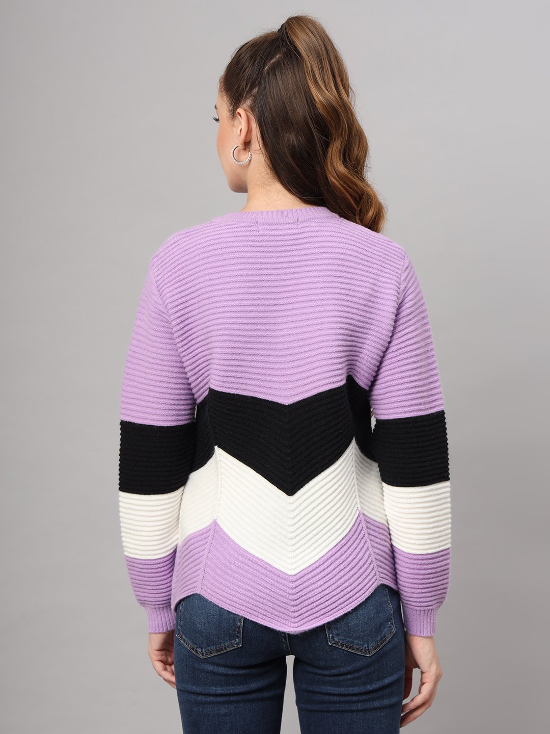 Women’s Lilac, Black & White Chevron Ribbed Knit Short-Length Winter Sweater Top