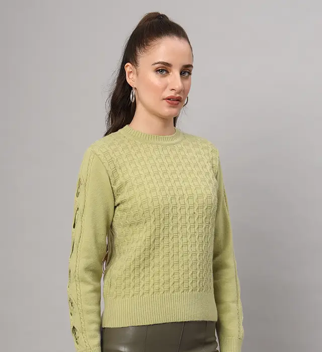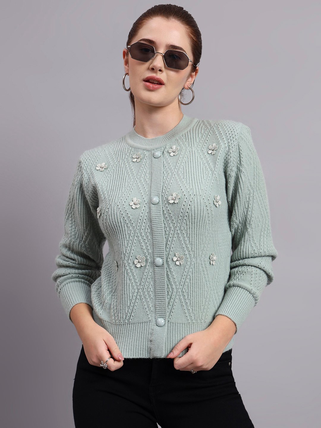 Daisy Embroidered Knit Cardigan | Premium Acrylic Wool Pista Green Women Sweater