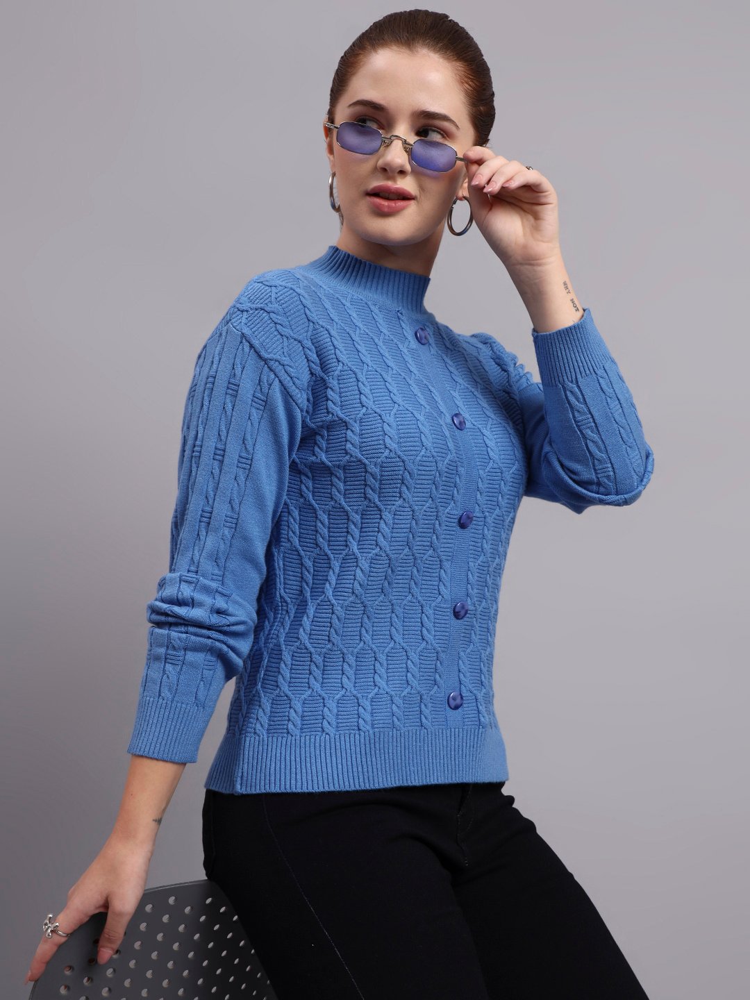 Textured Button-Down Ribbed Crew Neck | Premium Acrylic Wool Dark Sky Blue Sweater