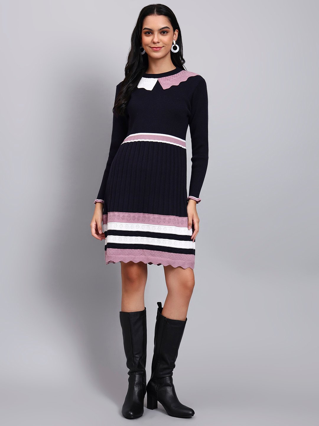 Women’s Navy Ribbed Knit Winter Dress with Pink Collar & Border Detailing