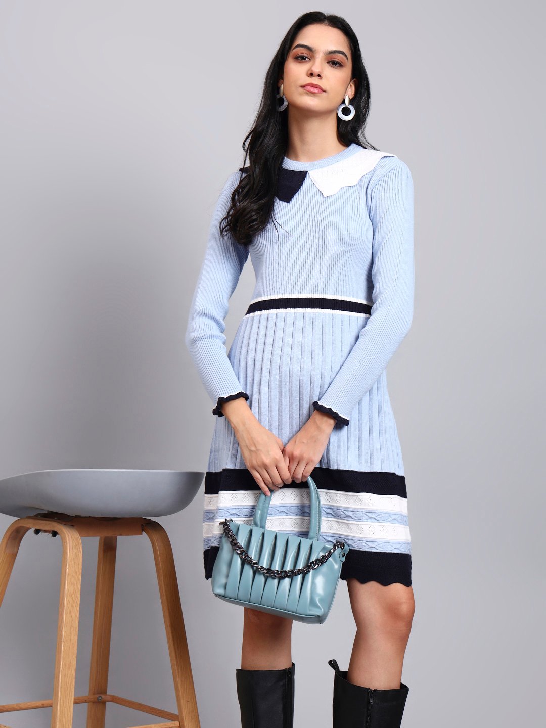 Women’s Sky Blue Ribbed Knit Winter Dress with White Collar & Navy Border