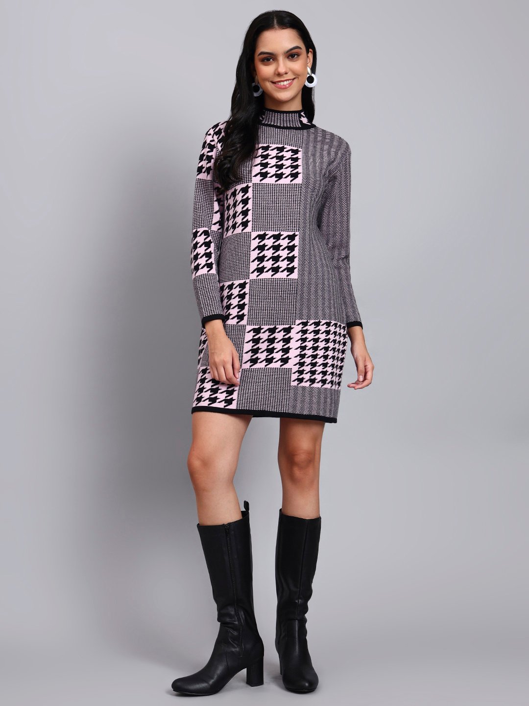 Women’s Black & Ivory Houndstooth Patterned Knit Winter Dress